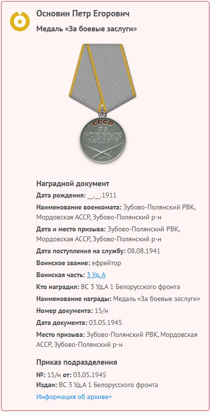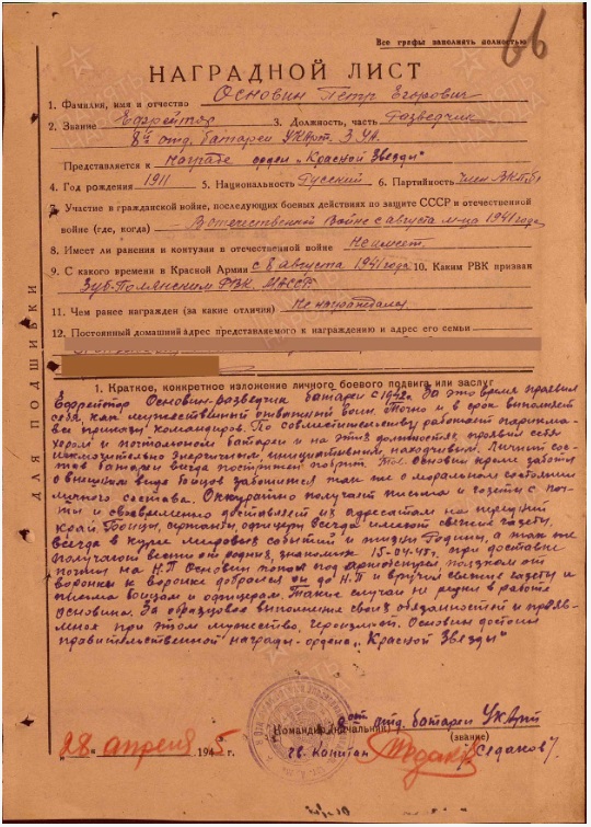 ![]() Основин Пётр Егорович (прадед секретаря суда Поцелуйко С.П.) родился в 1911 году в с.Сошниковка, Вадинского района Пензенской области. Был призван на военную службу Зубово-Полянским РВК Мордовской АССР 08.08.1941 года. Звание – Ефрейтор, должность – разведчик 8-й отдельной батареи управления командующего артиллерией армии 3-й ударной армии. Награждён 28.04.1945-правительственной наградой орденом «Красной звезды» и 03.05.1945 - медалью за боевые заслуги 2 степени. Краткое изложение личного боевого подвига или заслуг из наградного листа. Ефрейтор Основин – разведчик батареи с 1942 г. За это время проявил себя, как мужественный ответственный воин. Точно и в срок выполняет все приказы командиров. По совместительству работал парикмахером и почтальоном батареи и на этих должностях проявил себя исключительно энергичным, инициативным, находчивым. Личный состав батареи всегда пострижен и побрит. Тов. Основин, кроме заботы о внешнем виде бойцов, заботился также о моральном состоянии личного состава. Аккуратно получал письма и газеты с почты и своевременно доставляет их адресатам на передний край. Бойцы, сержанты, офицеры всегда имели свежие газеты, всегда в курсе мировых событий и жизни Родины, а также получали вести от родни, знакомых. 15.04.45 при доставке почты на Н.П. Основина попал под артобстрел. За образцовое исполнение своих обязанностей и проявления при этом мужества, героизма, Основин был удостоен правительственной наградой – орденом «Красной звезды». ![]() ![]() |
