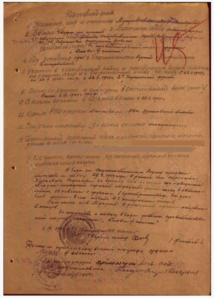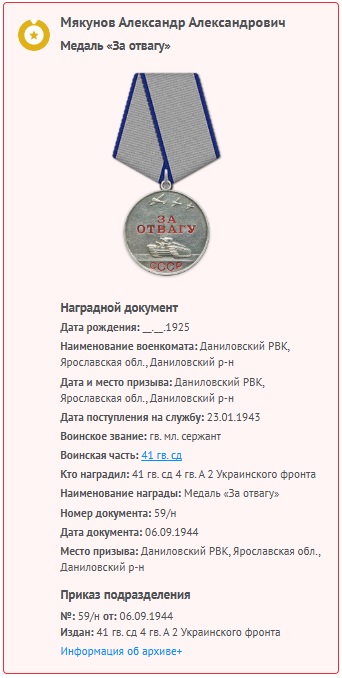 ![]() Мякунов Александр Александрович (родственник заместителя начальника отдела Мякуновой О.П.) 1925 года рождения родился в с. Васильево Даниловского района Ярославской области Дата поступления на службу: 21.01.1943 Место призыва: Даниловский РВК, Ярославская обл., Даниловский р-н Воинская часть: Раменский военно-пересыльный пункт (Московский областной военный комиссариат г. Раменское), Московская обл., г. Раменское Подольский РВК, Подольский ГВК, 41 гвардейская стрелковая дивизия, 703 стрелковый полк, 41 стрелковая дивизия, 200 армейский запасной стрелковый полк, 3 Украинский фронт, 449 стрелковый полк, 144 стрелковой дивизии, 200 запасной стрелковый полк, 47 запасной стрелковой бригады, 111 запасной стрелковый полк, 31 запасной стрелковой дивизии, Даниловский РВК Награды: Орден Отечественной войны II степени, Медаль «За отвагу» Краткая биография: Мякунов Александр Александрович 29 августа 1925 года рождения родился в Ярославской области, Даниловский район, д.Василево. Окончил 7 классов. В 1943 добровольно пошел на фронт. Во время войны служил наводчиком орудия. Дважды был ранен. Имел звание младший сержант. Выписка из наградного листа: «В боях за Социалистическую Родину проявил мужество и отвагу. 29.8.1944 года в районе сел ... за время боев из орудия где наводчиком гвардии младшим сержантом Мякуновым уничтожено 2 автомашины, 13 повозок с грузами, 1 бронетранспортер. За день боев орудием было отбито 4 контратаки немцев. Сам лично тов. Мякунов в рукопашной схватке истребил 6 немцев.» ![]() ![]() ![]() |